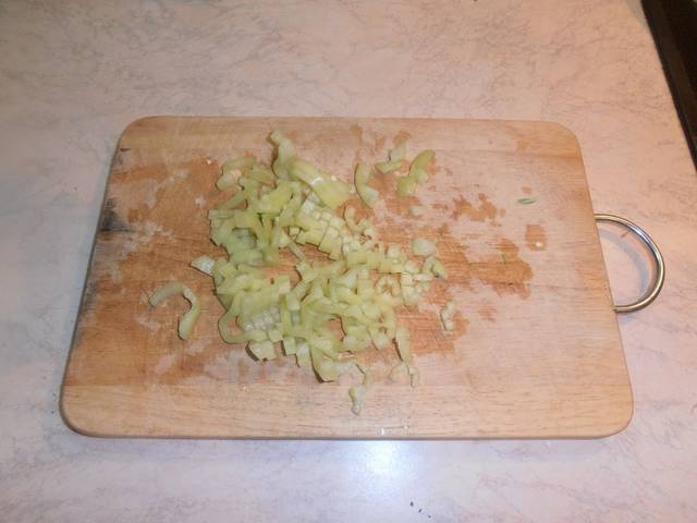 Κόβουμε την πιπεριά στη μέση, αφαιρούμε το κοτσάνι και τους σπόρους και στη συνέχεια την κόβουμε σε λεπτές λωρίδες.