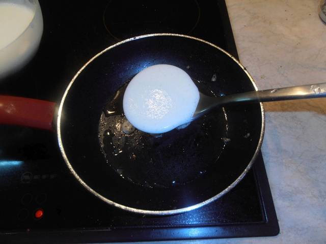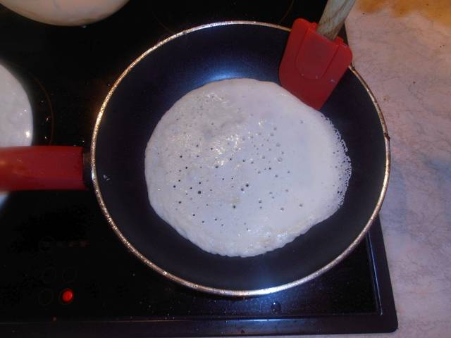 Ρίχνουμε μία κουτάλα από το κουρκούτι στο καυτό τηγάνι,
