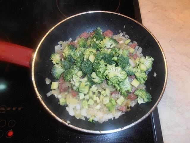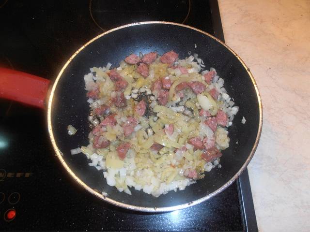 Προσθέτουμε και το λουκάνικο (προαιρετικό, εάν θέλετε πιο ελαφριά τη γέμιση αποφύγετέ το) και το αφήνουμε για 2-3 λεπτά να νοστιμίσει με τα λαχανικά.