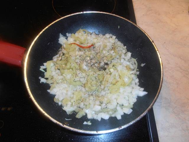 Χαμηλώνουμε την ένταση και ρίχνουμε αρχικά το κρεμμύδι και την πιπεριά, και τα μαλακώνουμε για 8-10 λεπτά. Αλάτι και πιπέρι ανάλογα με τα γούστα και, μαζί τους, και η απαραίτητη καυτερή πιπερίτσα. Μικρή εδώ, αφού θα φάνε και παιδάκια…