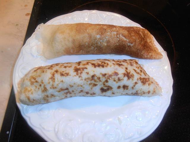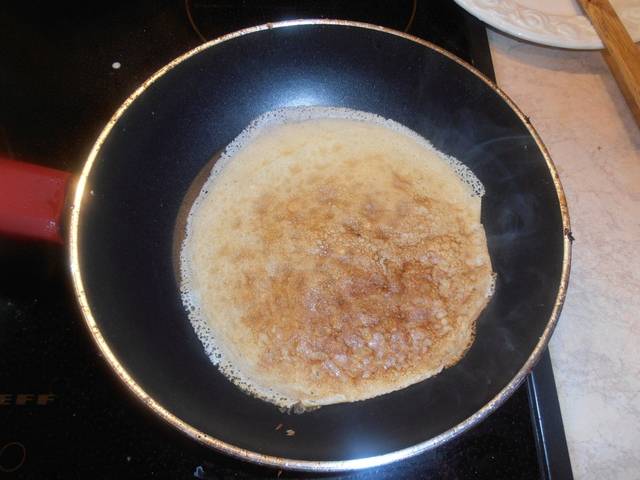Ψήνουμε για 2-3 λεπτά σε φούλ ένταση. Όταν η κρέπα είναι ψημένη από τη μία πλευρά (την ανασηκώνουμε με τη σπάτουλα και ελέγχουμε) και ξεκολλάει εάν ανακινήσουμε το τηγάνι), την γυρίζουμε να ψηθεί και από την άλλη πλευρά (για ελαφρά λιγότερο χρόνο).