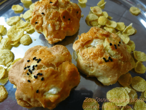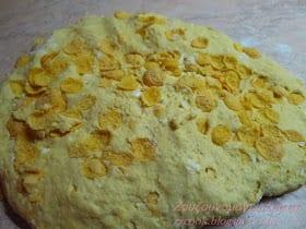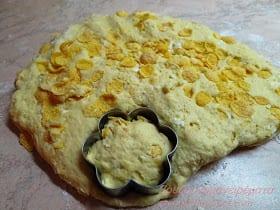 Προσθέτουμε και το τυρί με τις νιφάδες καλαμποκιού τα ανακατεύουμε απαλά να μην σπάσουν πολύ οι νιφάδες. Κόβουμε σε σχήματα τη ζύμη ή κάνουμε μπαλάκια όσο ένα καρύδι και τα τοποθετούμε σε ταψί με λαδόκολλα.