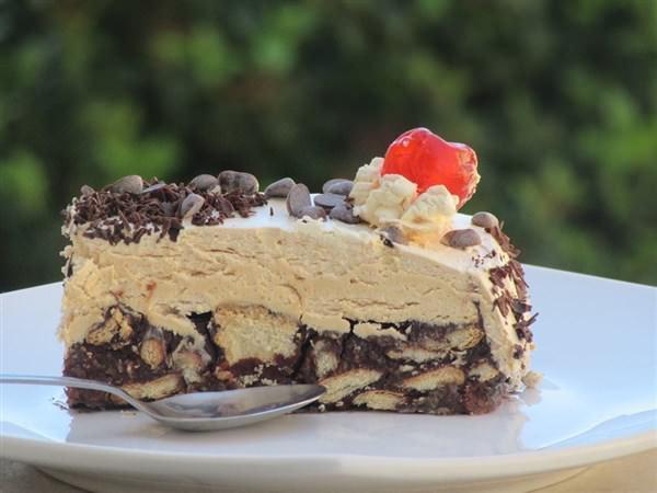 Όταν είναι έτοιμη την βγάζουμε από το τσέρκι μας, χτυπάμε την σαντιγί που την έχουμε βάλει νωρίτερα στο ψυγείο και την γαρνίρουμε, πασπαλίζουμε με τριμμένα και ολόκληρα μπισκότα και σιρόπι καραμέλας ή όπως αλλιώς εσείς θέλετε…!!!
