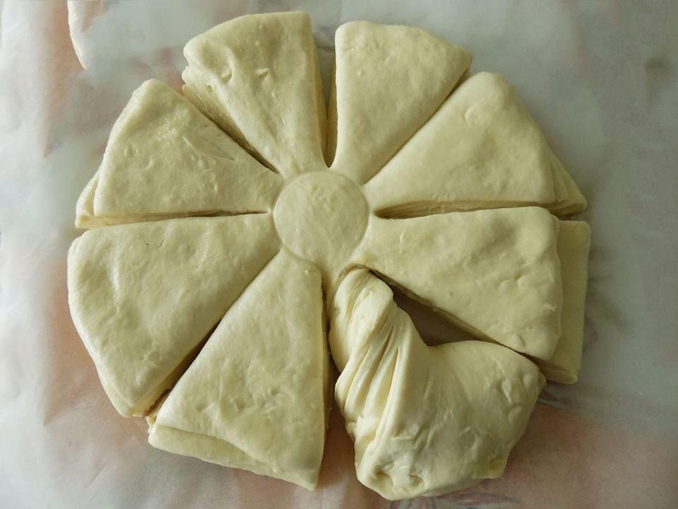 Επαναλαμβάνουμε το ίδιο μέχρι την τέταρτη.στη μέση βάζουμε ένα ποτήρι και πατάμε ελαφρά. Το κόβουμε σε 8 κομμάτια και στρίβουμε το κάθε ένα ξεχωριστά,το αφήνουμε 40 λεπτά να φουσκώσει. Αλείφουμε τον κρόκο,και προσθέτουμε σουσάμι. Προθερμαίνουμε τον φούρνο σε 180 βαθμούς και το ψήνουμε 35-40 λεπτά.Καλή επιτυχία !!!
