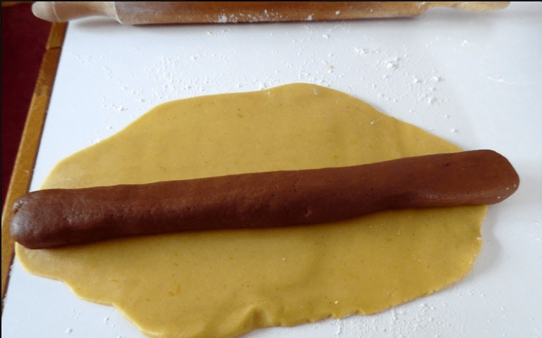 Μεταφέρουμε την λευκή ζύμη σε επιφάνεια εργασίας που την έχουμε πασπαλίσει με λίγο αλεύρι, την χωρίζουμε σε δυο ίσα μέρη και την ανοίγουμε σε χοντρό φύλλο. Πλάθουμε ένα χοντρό κορδόνι με την μισή σοκολατένια ζύμη, το τοποθετούμε στο κέντρο της λευκής ζύμης και διπλώνουμε προς τα μέσα, σχηματίζοντας ρολό.