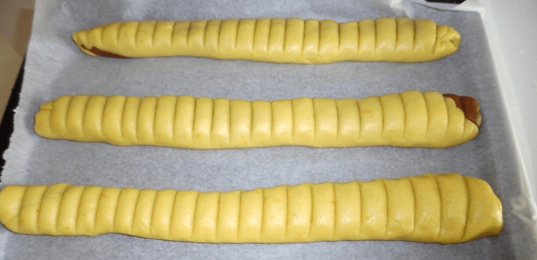Τοποθετούμε τα ρολά στο ταψί και χαράζουμε σε ίσες αποστάσεις, αρκετά βαθιά, την επιφάνεια χωρίς όμως να φτάσουμε στον πάτο.