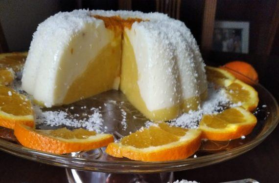 Βράζουμε και τις δύο κρέμες ξεχωριστά σε χαμηλή φωτιά και ανακατεύουμε συνεχώς. Αφού οι κρέμες μας δέσουν καλά παίρνουμε μία φόρμα για κέικ και βάζουμε στον πάτο της λίγο ελαιόλαδο. Προσθέτουμε πρώτα την λευκή κρέμα. Όπως είναι ζεστή, αμέσως, προσθέτουμε από πάνω και την κρέμα πορτοκαλιού.