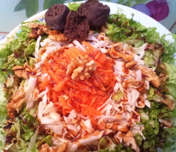 Συνταγή για ανάμεικτη σαλάτα με ντρέσινγκ από πετιμέζι. Μια ανάμεικτη σαλάτα με μαρούλι και λάχανο, καρότο και ξηρούς καρπούς, φουλ στις βιταμίνες.