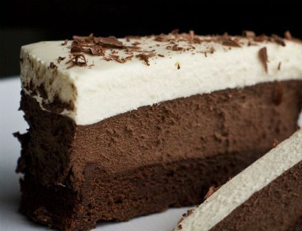 4.Μόλις σφίξει ελαφρώς, επαναλαμβάνετε την ίδια διαδικασία με άλλα 200 ml και τα κομματάκια λευκής σοκολάτας. Στρώνετε το μείγμα, προσεκτικά [χύνοντάς το πάνω στην ανάποδη ενός κουταλιού ώστε να σχηματισθεί “συντριβάνι”] πάνω στο σοκολατένιο μείγμα σοκολάτας. Το ξαναβάζετε στη κατάψυξη για λίγο μέχρι να σφίξει.