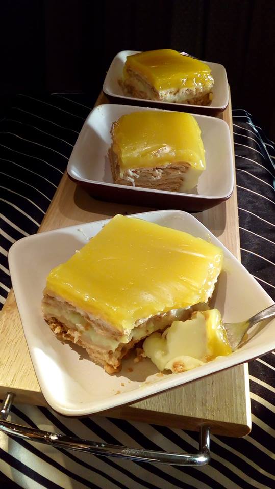 Βάζουμε 3 σειρές δηλαδή την μια πάνω στην άλλη στο τάπερ μουσκεύοντασ τα λίγο με λίγο γάλα μπισκότα πτι μπερ. Κάνουμε μια κρέμα βανίλιας με 1 κιλό γάλα,6 κουταλιές της σούπας ζάχαρη και 100 γραμμάρια κορν φλάουρ και την ρίχνουμε πανω΄ Οπότε ξανά τοποθετούμε ξανά μπισκότα με τον ίδιο τρόπο και κάνουμε και μια κρέμα πορτοκαλιού: Βάζουμε 3 φλιτζάνια τσαγιού πορτοκαλάδα στην κατσαρόλα με 4 κουταλιές της σούπας ζάχαρη ανακατεύουμε και ρίχνουμε μέσα διαλυμένο 100 γραμμάρια κορν φλάουρ το οποίο διαλύσαμε σε μισό φλιτζάνι τσαγιού πορτοκαλάδα. Οπότε μόλις πήξει το κατεβάζουμε και το ρίχνουμε πάνω στα μπισκότα. Μόλις κρυώσει το τοποθετούμε ψυγείο!