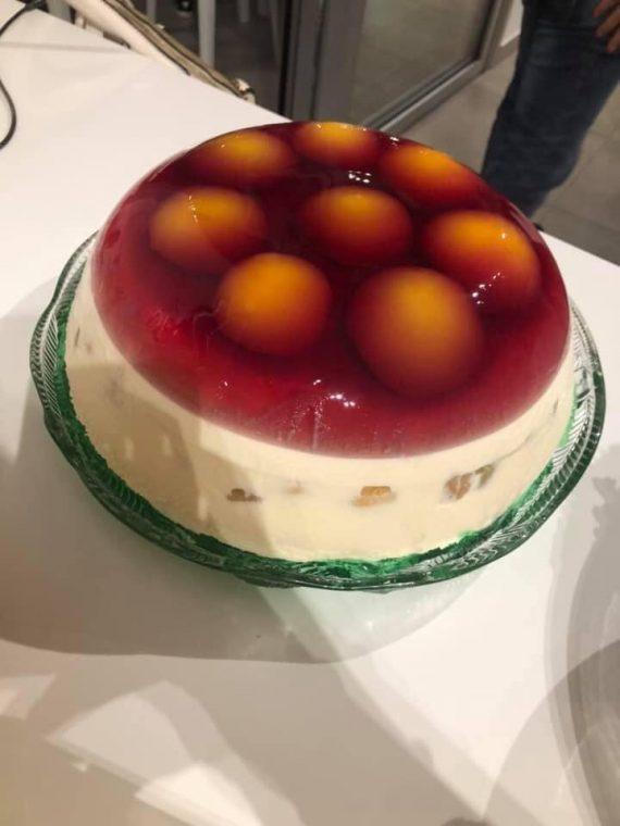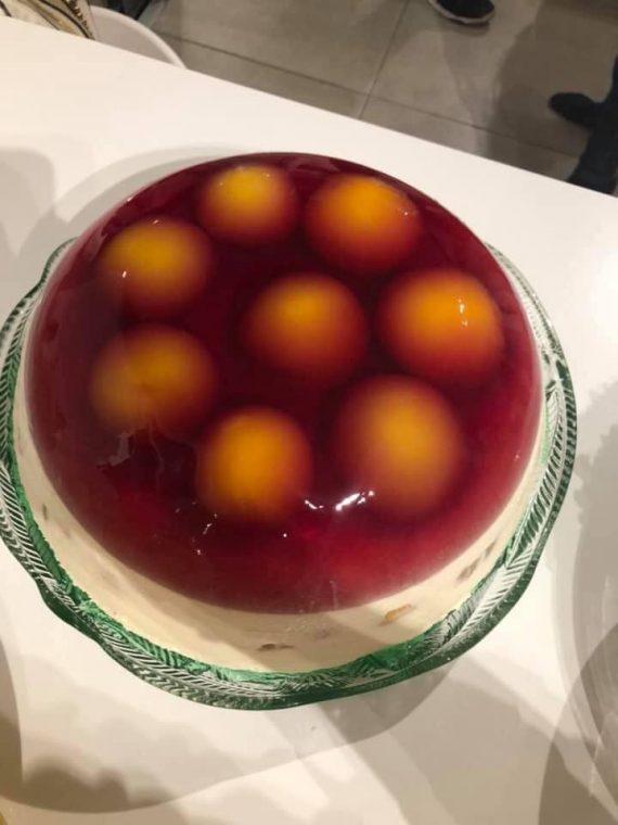 Βάζουμε μέσα την κομπόστα ροδάκινου από την ανάποδη μεριά. Το βάζουμε στο ψυγείο να πήξει καλά. Ετοιμάζουμε 6 ποτηριά νερό με 2 φακελάκια ζελέ μπανάνα και το αφήνουμε να κρυώσει καλά. Χτυπάμε 3 φακελάκια dream topping με 3 ποτήρια γάλα και τα αναμιγνύουμε με το κίτρινο ζελέ. Τέλος το βάζουμε στο ψυγείο να πήξει καλά.