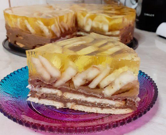 Στο μεταξύ ετοιμάζουμε τον ζελέ σύμφωνα με τις οδηγίες της συσκευασίας και βάζουμε στο ψυγείο μέχρι να γίνει σαν μέλι. Βγάζουμε το γλυκό από το ψυγείο, στρώνουμε τις μπανάνες από πάνω τις οποίες τις έχουμε κόψει σε ροδέλες και ρίχνουμε από πάνω τον ζελέ. Αφήνουμε το γλυκό μας στο ψυγείο μέχρι να παγώσει καλά.