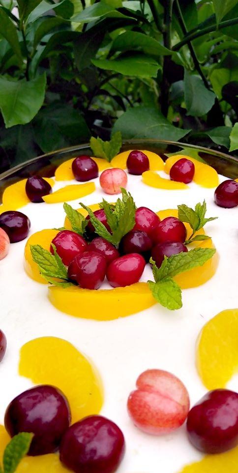Και συνεχίζουμε ξανά την ίδια διαδικασία και με τα υπόλοιπα υλικά μέχρι να βγει το αποτέλεσμα που βλέπετε στις φωτογραφίες. Όταν παγώσει καλά το γλυκό μας, το γαρνίρουμε με φρούτα αρεσκείας μας! Καλή απόλαυση!