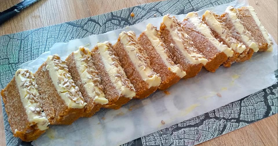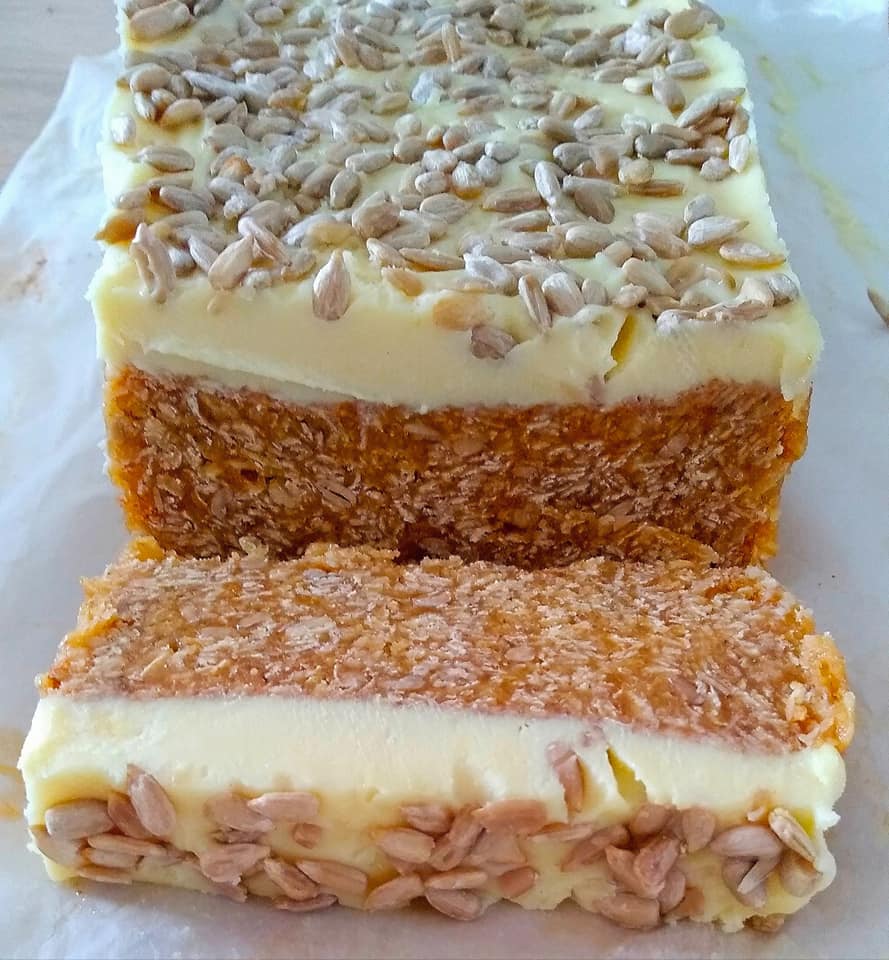 Αδειάζουμε το μείγμα σε ένα μπολ και προσθέτουμε τη βρώμη και τον ηλιόσπορο. Ανακατεύουμε και αδειάζουμε σε φόρμα μεταλλική μακρόστενη σε λαδόκολλα.