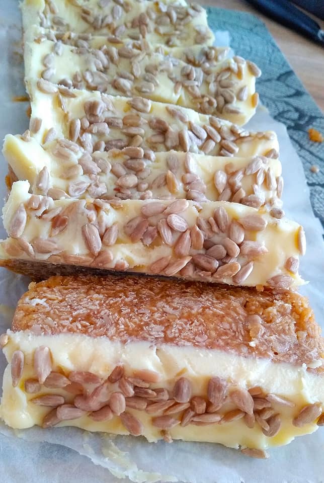 Ανακατεύουμε τη λευκή κουβερτούρα και το γιαούρτι. Αφήνουμε στο ψυγείο κάποιες ώρες να σφίξει το μείγμα (ιδανικά όλο το βράδυ), κόβουμε φέτες και διατηρούμε εκεί.