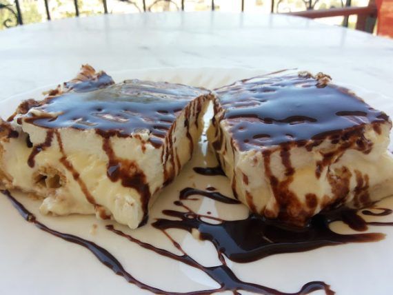 Καλύπτουμε με την σαντιγύ που ήδη έχουμε ετοιμάσει και γαρνίρουμε με την σάλτσα σοκολάτας. Κόβουμε το γλυκό σε τετράγωνα κομμάτια και σερβίρουμε.