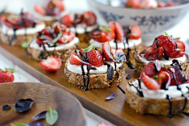 Αλείφεις τυρί τύπου φιλαδέλφεια που θα έχεις ανακατέψει με λίγη κρέμα γάλακτος για να γίνει πιο αφράτο, πάνω σε φρυγανισμένες φέτες ψωμιού, βάζεις από πάνω φράουλες και περιχύνεις με κρέμα μπαλσάμικο.