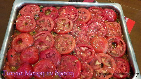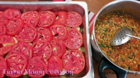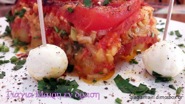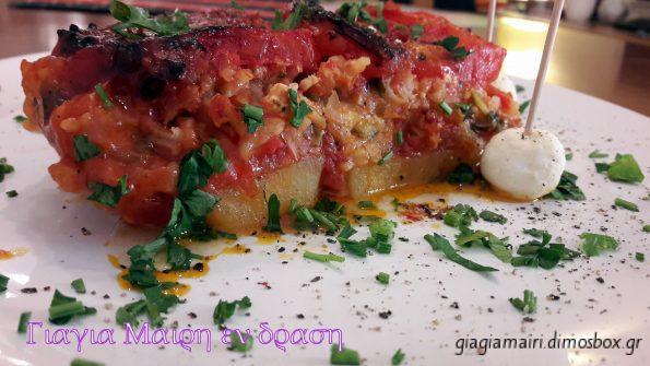 Σε μια κατσαρόλα βάζουμε το ελαιόλαδο και σοτάρουμε το κρεμμύδι με το σκόρδο. Συνεχίζουμε με τις πιπεριές την μελιτζάνα το κολοκύθι και το ρύζι. Προσθέτουμε το αλατοπίπερο τον χυμό ντομάτας μαι με το νερό και τον ντοματοπελτέ. Αν οι ντομάτες που θα βάλετε στο ταψί δεν είναι αρκετά γινωμένες να βγάλουν μπόλικα υγρά ίσως χρειαστείτε λίγο ακόμα νεράκι. Τέλος ρίχνουμε τον μαϊντανό με τον δυόσμο και σβήνουμε την φωτιά αφήνοντας να ξεκούραστη λιγάκι το μείγμα μας. Σε ένα μεγάλο ταψί στρώνουμε μια σειρά πατάτες ροδέλες και από πάνω μια σειρά ντομάτες σε ροδέλες. Κάθε στρώσει κάλο είναι να ρίχνετε λιγάκι αλατάκι και πάνω στις ντομάτες λίγη ζαχαρίτσα. Αδειάζουμε όλη την γέμιση από την κατσαρόλα πάνω στις ντομάτες μας. Τρίβουμε αν θέλουμε λίγη φετούλα από πάνω και σκεπάζουμε με ροδέλες ντομάτας. Αλατοπιπερώνουμε προσθέτουμε και λίγο ελαιόλαδο και ψήνουμε στους 180 με 200 μέχρι να ροδίσουν οι ντοματούλες μας περίπου μια ώρα και 30 λεπτά. Καλό θα είναι να κάνετε το φαγάκι σας νωρίς να είναι κρύο για το σερβίρισμα. Όμως όπως και να το κάνετε είναι ένα υπέροχο φαγάκι που θα σας ενθουσίασει!!!