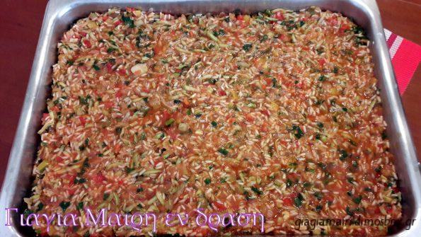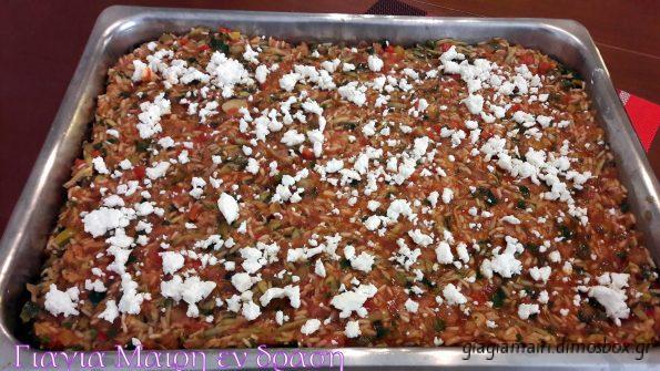 8 ντομάτες σε ροδέλες 4 πατάτες σε ροδέλες 2 κολοκυθάκια χοντροτριμμένα 1 μελιτζάνα σε μικρά κυβάκια 1/2 πιπεριά κόκκινη σε μικρά κυβάκια 1/2 πιπεριά πράσινη σε μικρά κυβάκια μια χούφτα ψιλοκομμένο μαϊντανό μπόλικο φρέσκο δυόσμο ψιλοκομμένο 2 κρεμμύδια χοντροκομμένα 2 σκελίδες σκόρδο τριμμένες 1 ποτηράκι του κρασιού ελαιόλαδο 1 κσ ζάχαρη καστανή 3/4 ποτηριού ρύζι Καρολίνα 1 κουτί ντοματοχυμό 1 1/2 ποτήρια νερό 1 κσ πελτέ ντομάτας μπόλικο αλατοπίπερο ένα κομμάτι φέτα