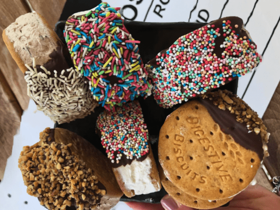 Για σοκολατένια γέμιση ρίχνουμε κακάο στην κρέμα, όσο θέλουμε αναλόγως το χρώμα που μας αρέσει, και συνεχίζουμε την ίδια διαδικασία. Βάζουμε στην κατάψυξη για τουλάχιστον 6 ώρες πριν σερβίρουμε. Βγαίνουν 32 παγωτά.