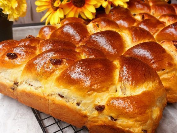1100g all-purpose flour 3 sachets of dry yeast (21g) 500g warm milk 2 eggs 130g of butter 150g of sugar 250g raisins Optionally 1 tsp Cinnamon Grease 1 egg with a little water for spreading