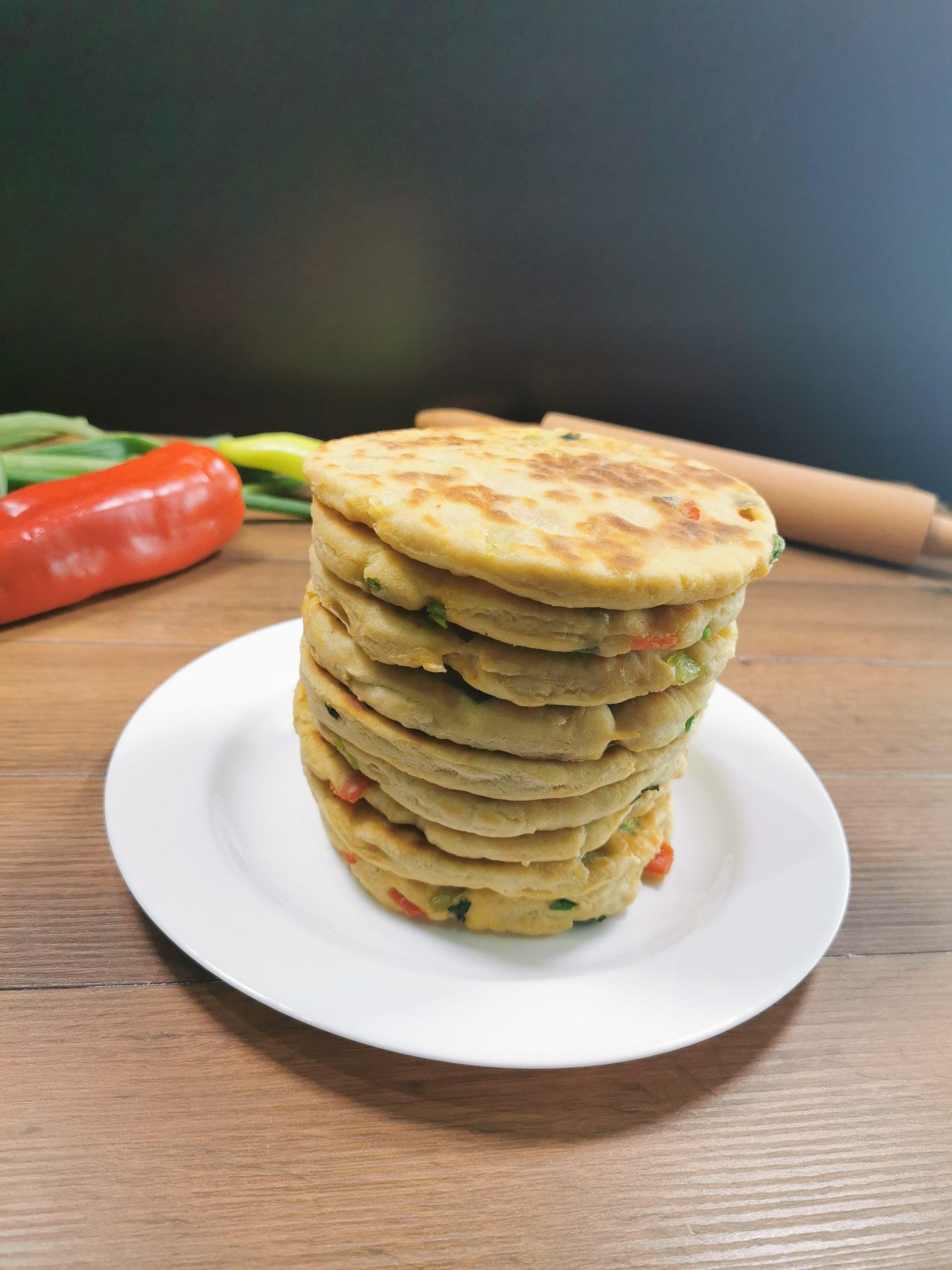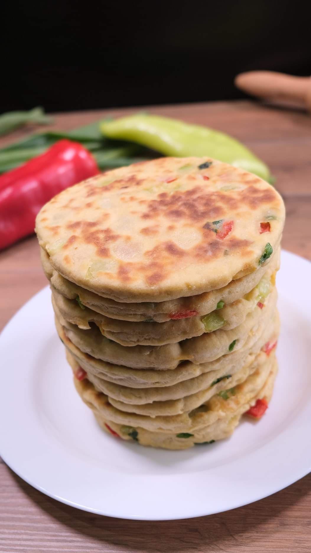 550 g all purpose flour 200 g yoghurt 100 g water 1 medium egg 2 green onions 1 red pepper 1 green pepper 20 g baking powder 1 tsp baking soda 1 tbsp salt 20 ml extra virgin olive oil bio