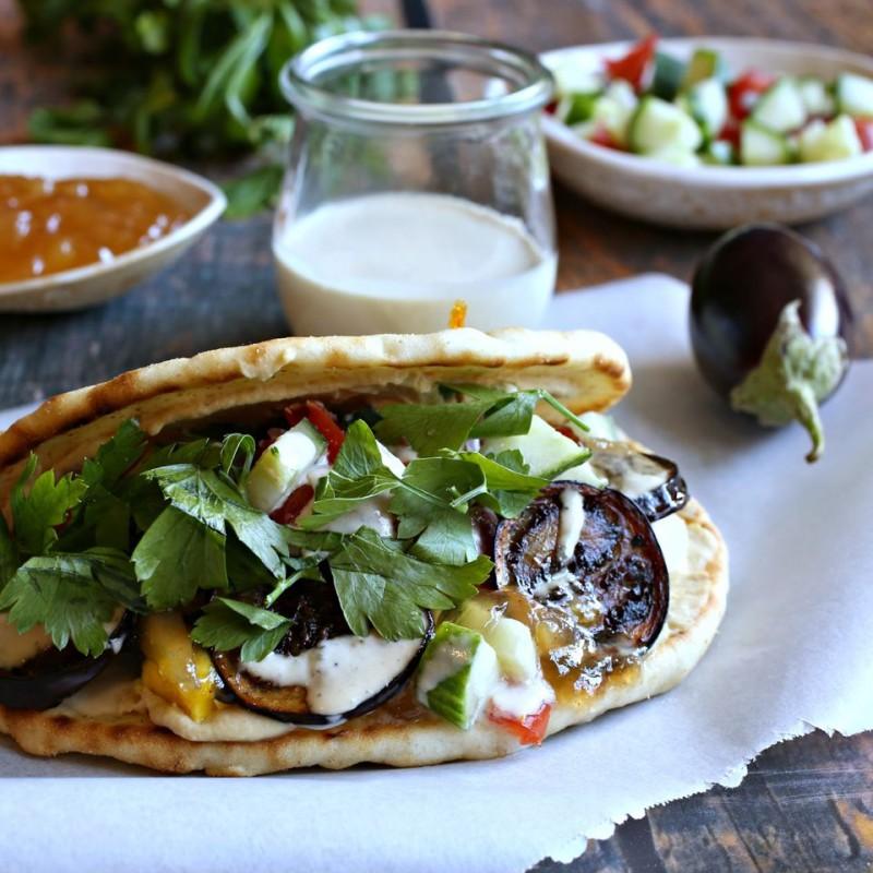Να μια ακόμη συνταγή με πίτα που έρχεται από τη Μέση ανατολή κι είναι πολύ δημοφιλής. Μέσα σε αραβική πίτα βάζετε μελιτζάνα τηγανιτή, κομμάτια βραστού αυγού, ντομάτες, αγγούρι, πιπεριές, πολύ μαϊντανό και κρεμμύδια ψιλοκομμένα και μια σάλτσα που σας αρέσει. Ιδανικά ταιριάζει με μια γλυκιά και πικάντικη σάλτσα.Δείτε εδώ ιδέες πολλές