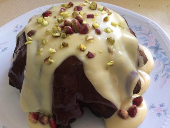 Ειναι πεντανόστιμη και αξιζει τον κοπο να τη δοκιμασετε Υλικα: 150 γρ αλευρι γοχ 140 γρ αχνη 3 αυγα Μια πρεζα αλατι 150 γρ ελαιολαδο 200 γρ φυστικι Αιγινης τριμενο σε σκονη Ξυσμα απο μισο πορτοκαλι 3 γρ μαγια Για το σιροπι Μολις παρει βραση ,100 γρ φρεσκος χυμος πορτοκαλι και 50 γρ ζαχαρη κρυσταλικη,μετραω 2 λεπτα και το αποσυρω απο τη φωτια Εκτελεση: Σε μπολ ανακατευω το λαδι ,την αχνη και τα αυγα Σε αλλο μπολ ανακατευω αλευρι ,μαγια και αλατι και τα προσθετω ανακατευοντας στο πρωτο μειγμα. Τελος ριχνω τα φυστικια και το ξυσμα Αδιαζω σε λαδωμενη φορμα ( 22χ11 cm) Ψηνω σε προθερμασμενο φουρνο στους 180 για 50 λεπτα και στους 170 για αλλα 10 λεπτα.Του ριχνω το σιροπι πορτοκαλιου.Εγω ,αντι του σιροπιου ,του εριξα μαυρη και λευκη σοκολατα.