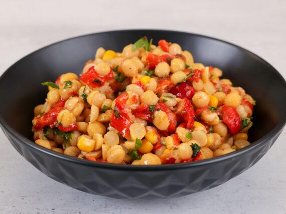 Συνταγή για καλοκαιρινή νηστίσιμη σαλάτα με ρεβίθια, πιπεριές, καλαμπόκι και βινεγκρέτ κολοκύθας για την νηστεία του Δεκαπενταύγουστου ή για μία vegan διατροφή. Δοκιμάστε τη ρεβιθοσαλάτα για ένα χορταστικό μεσημεριανό ή βραδινό και με τα ρεβίθια που περίσσεψαν από τους φίλους μας Foodaholics.