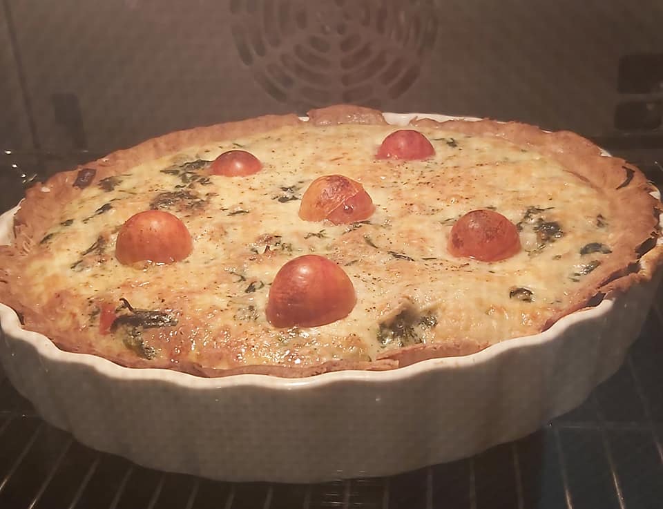Όταν κρυώσει προσθέτουμε το σπανάκι, το οποίο δεν πρέπει να έχει καθόλου υγρά. Ρίχνουμε την κρέμα γάλακτος με ένα κουτάλι και στη συνέχεια προσθέτουμε τα τυριά, τα ντοματίνια και λίγο πιπέρι. Ψήνουμε την Κις Λορέν μας για 35 με 40 λεπτά στους 180 βαθμούς Κελσίου.