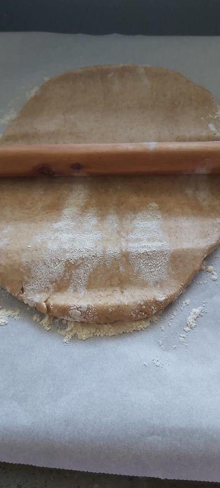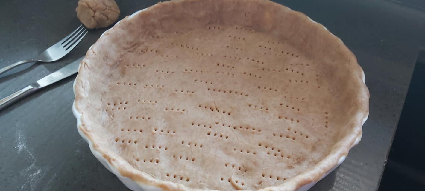 Με τη βοήθεια του πλάστη απλώνουμε μέσα στην ταρτιέρα και στα πλαϊνά. Ότι εξέχει το κόβουμε. Στη συνέχεια τρυπάμε με το πιρούνι την ζύμη και τοποθετούμε πάνω της χαρτί ψησίματος. Ρίχνουμε ρύζι ή όποιο άλλο όσπριο επιθυμούμε και την βάζουμε να ψηθεί για 15 λεπτά στον φούρνο, στους 180 βαθμούς Κελσίου.