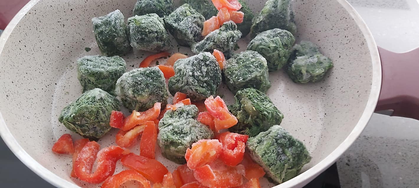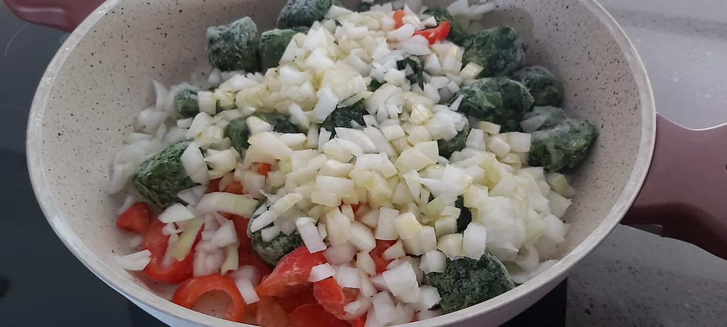Τυλίγουμε την ζύμη σε μια διαφάνεια και την τοποθετούμε στο ψυγείο. Για να κάνουμε την γέμιση προσθέτουμε σε ένα τηγάνι το κρεμμύδι, το σκόρδο, το ελαιόλαδο, το σπανάκι και την πιπεριά και σοτάρουμε. Προσθέτουμε το αλάτι και το πιπέρι και αφήνουμε το μείγμα μας να ψηθεί μέχρι να απορροφήσει όλα τα υγρά.