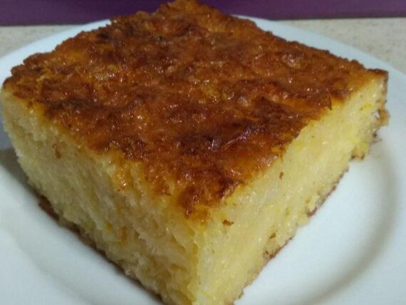 Αδειάζουμε το μείγμα σε ένα βουτυρωμένο ταψί 25×35 και ψήνουμε στους 180 βαθμούς Κελσίου για 35 λεπτά περίπου μέχρι να ροδίσει καλά πάνω και κάτω.