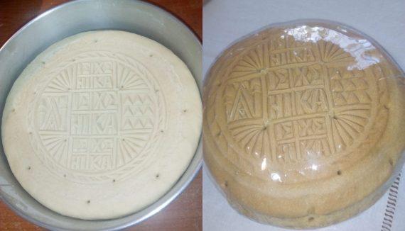 Αν βάλουμε μαγιά δεν κρατάμε. Τρυπάμε με οδοντογλυφίδα ή ξυλάκι από σουβλάκι όχι όμως στο κέντρο που είναι ο αμνός που θα προσκομίσει ο ιερέας. Σκεπάζουμε με πετσέτα διπλή και βάζουμε στο φούρνο στους 50 βαθμούς να γίνουν. Προσέχουμε μην μας παραγίνουν και σκάσει η σφραγίδα μας. Βγάζουμε και προθερμαίνουμε στους160 αέρα.
