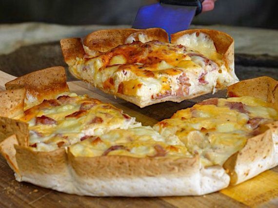 Put the tortilla in a 20 cm baking pan. In a bowl, mix the eggs with the yogurt and pepper and add the chopped cheese. Finely chop the cold cuts and add them to the mixture. Pour the mixture into the tart and bake in a preheated oven at 200 degrees until it turns brown.