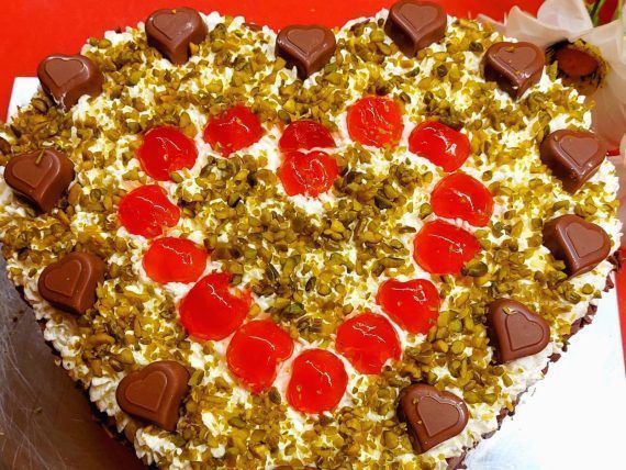Πασπαλίζουμε τα πλαϊνά με ψιλοκομμένη κουβερτούρα γάλακτος. Διακοσμούμε με κερασάκια γλασέ, τριμμένο φιστίκι Αιγίνης και σοκολατάκια καρδούλες.