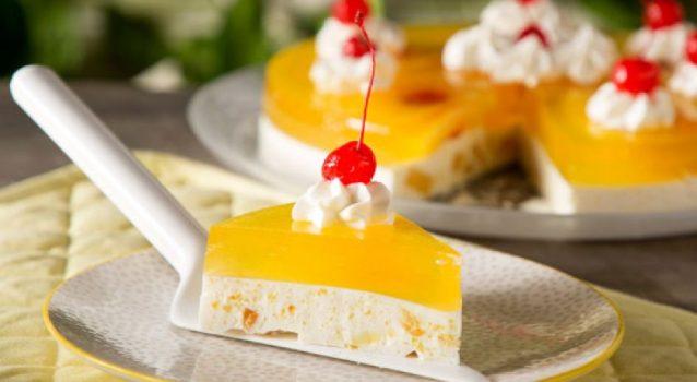 Ρίχνετε λίγο ζελέ στον πάτο μιας φόρμας 28 εκ. με σούστα και τη βάζετε στη κατάψυξη μέχρι να πήξει το ζελέ. Στη συνέχεια τοποθετείτε πάνω στο ζελέ μερικές λεπτές φέτες ανανά με τα κερασάκια στη μέση και τα περιχύνετε με λίγο ζελέ. Ξαναβάζετε τη φόρμα πάλι για λίγο στην κατάψυξη και μετά επαναλαμβάνετε την ίδια διαδικασία άλλη μια φορά δηλ. προσθέτετε λίγο ζελέ ακόμα και τη βάζετε πάλι στη κατάψυξη μέχρι να πήξει καλά. Θα χρησιμοποιήσετε περίπου το 1/3 της ποσότητας του ζελέ και το υπόλοιπο θα το βάλετε στο ψυγείο μέχρι να το χρησιμοποιήσετε.