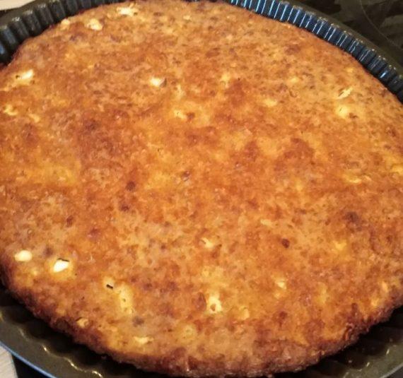 Στο δυνατό του φούρνου έβαλα ένα ταψάκι 32αρι με τρεις κουταλιές σούπας ελαιόλαδο να κάψει. Στο μεταξύ σε ένα μπολ με αυτή την σειρά χτύπησα τα αυγά, το γιαούρτι, το ηλιέλαιο, το μπέκιν, το μπαγιάτικο ψωμί σε ψίχουλα, την μυζήθρα, μία πρέζα πιπέρι, και την φέτα χοντροκομμένη. Έβγαλα το ταψάκι από το φούρνο έριξα το μείγμα μέσα και άρχισε να τσιρίζει ως συνήθως στο καυτό λάδι. Το έστρωσα, έριξα και από πάνω λίγο κεφαλοτύρι και το έβαλα στο φούρνο στους 180 βαθμούς να ψηθεί για μισή ωρίτσα.