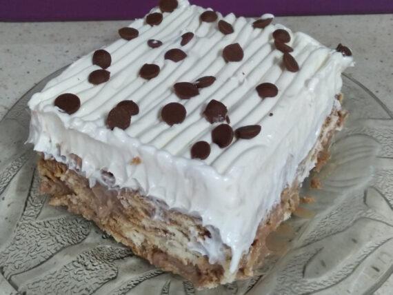 Μετά από τα οικογενειακά τραπέζια θέλουμε ένα γλυκάκι. Γι’ αυτό και αυτή τη φορά θα σας δείξουμε μία συνταγή για εύκολο γλυκό για τραπέζι με λίγα υλικά και πολλή απλή εκτέλεση. Για να μπορέσετε να το φτιάξετε με σίγουρη επιτυχία, ακόμη κι αν δεν έχετε χρόνο, πολλά λεφτά ή εμπειρία στην ζαχαροπλαστική. Με αφράτη κρέμα και τραγανή γέμιση μπισκότων!