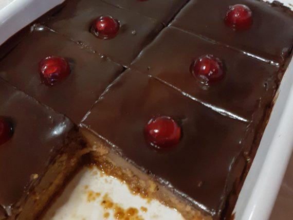 Ανακατεύουμε μέχρι να λιώσει το βούτυρο και βάζουμε το κατσαρολάκι στην άκρη μέχρι να έρθει σε θερμοκρασία δωματίου. Αφού έρθει σε θερμοκρασία δωματίου βάζουμε την γκανάζ σοκολάτας πάνω από την βουτυρόκρεμα. Βάζουμε το γλυκό στο ψυγείο μέχρι να παγώσει και απολαμβάνουμε.