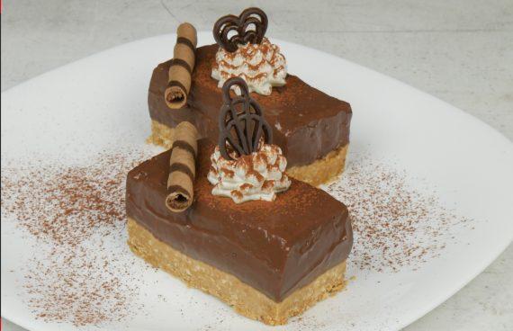 Αναμειγνύουμε τα θρυμματισμένα μπισκότα με την λιωμένο βούτυρο και το γάλα. Τα απλώνουμε σε φόρμα 28×18 εκατοστών με αντικολλητικό χαρτί. Τοποθετούμε την κρέμα, σκεπάζουμε με μεμβράνη και βάζουμε στο ψυγείο για 6 ώρες Σερβίρουμε όταν σταθεροποιηθεί με σαντιγί και κακάο.