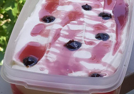 Ακολουθούμε την ίδια διαδικασία μέχρι να τελειώσει το μείγμα του παγωτού και τελειώνουμε με το σιρόπι βύσσινο. Το βάζουμε στην κατάψυξη μέχρι να παγώσει καλά και απολαμβάνουμε.