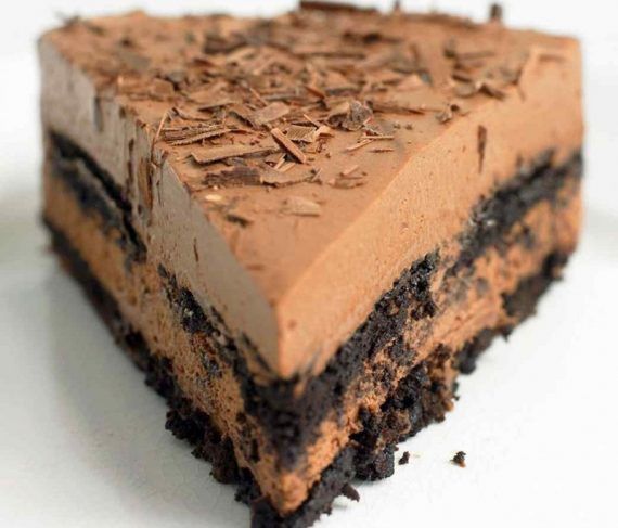 Καλύψτε το γλυκό σας με μια μεμβράνη και βάλτε το στο ψυγείο να κρυώσει για τουλάχιστον 6 ώρες, ιδανικά για όλο το βράδυ. Πριν σερβίρετε, με ένα αποφλοιωτή ξύνετε σε φλύδες τα υπόλοιπα 60 γρ. σοκολάτας και γαρνίρετε το γλυκό σας. Το ξεφορμάρετε, τραβώντας το από το χαρτί ψησίματος που προεξέχει και το τοποθετείτε σε πιατέλα. Βουτάτε ένα μαχαίρι σε ζεστό νερό και το κόβετε σε κομμάτια. Σκουπίστε το μαχαίρι πριν από κάθε κόψιμο κομματιού. Σερβίρετε.