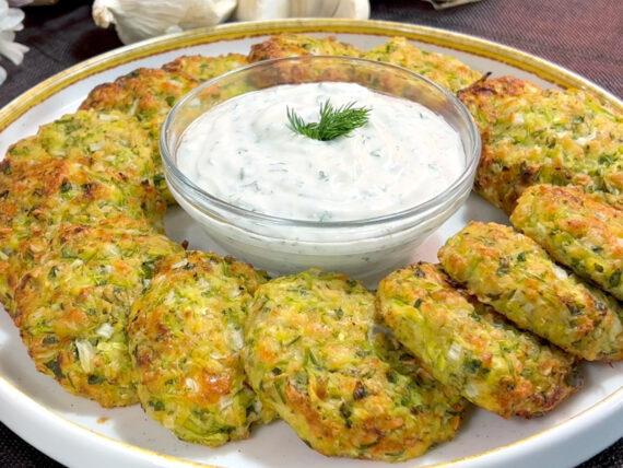 4 Zucchini (1 kg) 2 Prisen Salz ————————————————– —– 1 mittelgroße Zwiebel 2 Knoblauchzehen 2 mittelgroße Eier Petersilie 5-6 grüne Minzblätter 150 g Gruyère-Käse 100 g Haferflocken wenig Olivenöl 1/2 TL Salz Pfeffer 2 TL Mehl ————————————————– ——– 200 g Joghurt 2% Dill Zitronenschale halber Zitronensaft Olivenöl