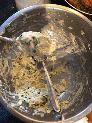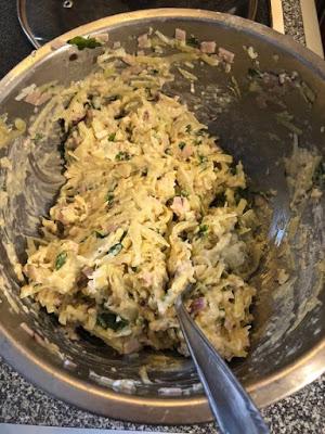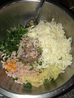 3 πατάτες τριμμένες στον τρίφτη ωμές 1 μεγάλο ξερό κρεμμύδι τριμμένο στον τρίφτη 2 φρέσκα κρεμμυδάκια ψιλοκομμένα 1+1/2 κούπες τσαγιού τυρί μαλακό τύπου γκούντα 8 κλωνιά μαιντανό ψιλοκομμένο 1 αυγό αλάτι -πιπέρι 1 σφηνάκι ελαιόλαδο 1 κοφτή κουταλιά σούπας μπέικιν πάουντερ αλεύρι για όλες τις χρήσεις όσο πάρει για ένα μείγμα να στέκετε στο κουτάλι -περίπου 1 κούπα γεμάτη τσαγιού . Ελαιόλαδο ή καλαμποκέλαιο για το τηγάνισμα