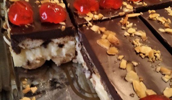 Προσθέτουμε την γκανάζ πάνω από τα μπισκότα όπως είναι ζεστή. Βάζουμε το γλυκό μας στο ψυγείο για να κρυώσει. Αφού κρυώσει προσθέτουμε τα κερασάκια και τα αμύγδαλα και σερβίρουμε.