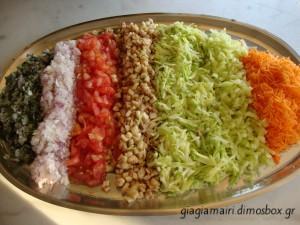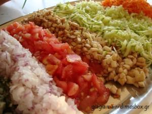 2 πιπεριές κέρατο σε κυβάκια την σάρκα απο τις μελτζάνες σε κυβάκια 1 κολοκυθάκι τριμμένο στο χοντρό του τρίφτη 2 καρότα στο ψιλό του τρίφτη 2 μεγάλα κρεμμύδια χοντροτριμμένα 3 σκελίδες σκόρδο μερικά φύλλα δυόσμο μια χούφτα μαϊντανό 2 κουταλιές πελτέ ντομάτας διαλυμένη σε ενα ποτηράκι νερό την σάρκα απο τις ντομάτες χοντροκομμένη μια κσ ρύζι για κάθε γεμιστό αν βάλετε κιμά αφαιρείτε 3-4 κουταλιές ρύζι αν θέλετε βάζετε μισή ποσότητα ρύζι Καρολίνα και μισή ρύζι για πιλάφι. αλατι πιπέρι και λίγο ελαιόλαδο