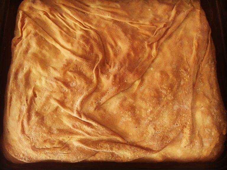 Βράζω ένα πακέτο μακαρόνια χοντρά με αλάτι κανονικά. Στραγγίζω και μέσα στην ίδια κατσαρόλα ρίχνω μία κουταλιά φρέσκο βούτυρο και ένα λίτρο γάλα. Αφήνω λίγο να κρυώσει και χτυπάω τέσσερα αυγά με λίγο αλάτι και πιπέρι και τα ρίχνω μέσα. Χοντρό τρίβω και μισό κιλό φέτα και την ρίχνω κι αυτή μέσα. Ανακατεύω καλά. Λαδώνω καλά το ταψί μου. Ανοίγω ένα ένα τα φύλλα μου. Εγώ βάζω δύο κάτω,στη μέση την γέμιση, δύο πάνω με αρκετό λάδι ενδιάμεσα στα φύλλα. Ψήνω πρώτα στην κάτω κάτω θέση του φούρνου για δεκαπέντε λεπτά για να πάρει χρώμα από κάτω και μετά μεταφέρω μία θέση πιο πάνω. Συνολικά καμιά ώρα στους 180′ πάνω κάτω.