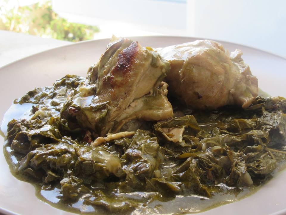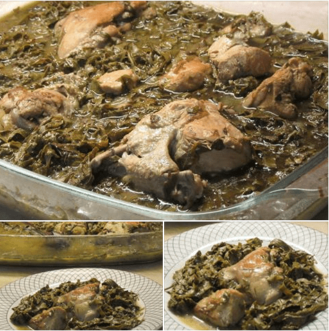 Ζεσταίνετε το ελαιόλαδο και σοτάρετε τις μερίδες του κοτόπουλου από όλες τις πλευρές, ρίξτε το κρεμμύδι και συνεχίζετε το σοτάρισμα μέχρι να μαραθεί,Προσθέτετε και τα αμπελόφυλλα ψιλοκομμένα σαν λαχανο σοτάρετε όλα μαζί για μερικά λεπτά και σβήνετε με το μισό χυμό λεμονιού….Ρίξτε και 2 φλιτζάνια του τσαγιού ζεστό νερό και σιγοβράστε το φαγητό με σκεπασμένη την κατσαρόλα για μια ώρα..αν χρειαστεί προσθέτετε λίγο νερό ακόμα,Τέλος διαλύετε το κορν φλαουρ με το υπόλοιπο χυμό λεμονιού και το ρίχνετε στην κατσαρόλα,Την ανακινείτε να πάει παντού και αφήνετε να σιγοβράζει για 3 λεπτά επιπλέον ..Σερβίρετε το φαγητό με πατάτες τηγανίτες..!!