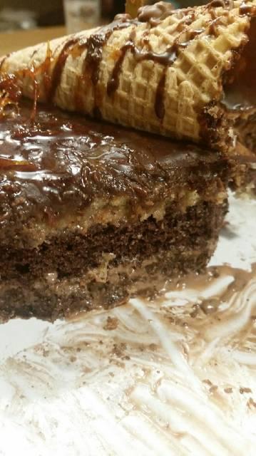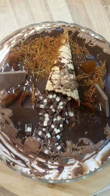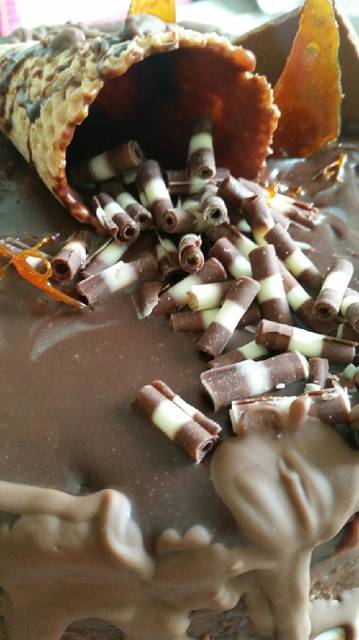 9. Για την διακόσμηση. Εγώ χρησιμοποίησα κομμάτια σοκολάτας γάλακτος αφού τα έκοψα σε τετραγωνάκια. ίνες καραμέλας και κομμάτια καραμέλας, χωνάκι βάφλας για παγωτό και διακοσμητική δίχρωμη σοκολάτα. Μπορείτε επιπλέον να προσθέσετε φρέσκα φρούτα ή ξηρούς καρπούς
